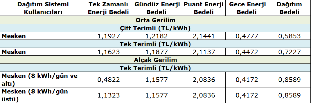 Diğer bir durum ise Kademeli Tarife’dir. Kademeli tarife de günlük 8 kWh aylık ise 240 kWh altında tüketiminiz olduğunda kademeli tarife kapsamında olup 240 kWh üstünde olan her bir kWh için kademeli tarife kapsamı dışında olmaktadır. Ayrıca tüketmiş olduğunu her bir kWh için ise Dağıtım Bedeli’ nin de eklendiğini belirtmek isterim. Aşağıdaki tablo da ise detaylı olarak elektrik birim fiyatlarını görebilirsiniz.
